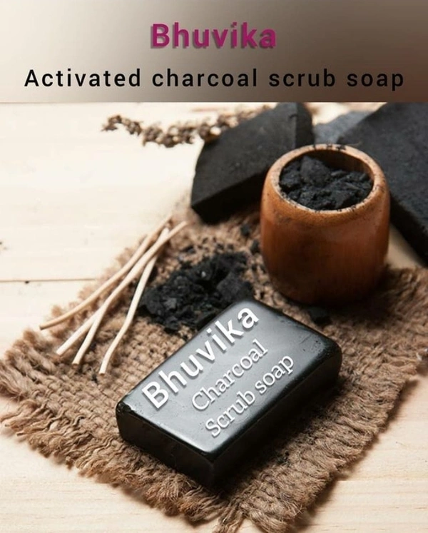 Bhuvika Handmade Charcoal Scrub Soap Ingredients: Natural Glycerine, Activated Charcoal Powder, Distilled Water. Benefits of Activated Charcoal Soap *Treats Oily Skin *Removes Acne *Reduces Pore Size *Clears Skin Blemishes *Treats Psoriasis *Provides Flawless Skin *Prevents Premature Aging *Makes Skin Trighter And Frimer *Suits Every Skin Type Effective For All Types of Skin 100% Original.